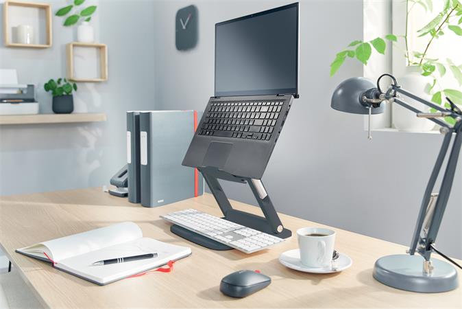 A Leitz Ergo notebook állvány a tökéletes ergonomikus magasságba emeli a laptop képernyőjét, így kényelmesebb betekintési szöget és testtartást biztosít.