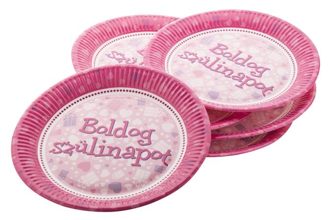 Tányér, papír, 23 cm, "Boldog Születésnapot", rózsaszín